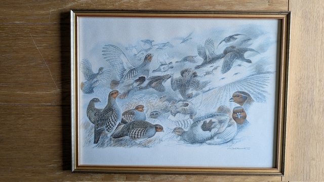 Etude de perdrix grises de Francis Bérille signée et datée 1976 dans la planche.