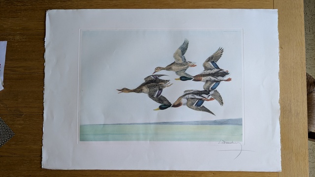 Très belle aquatinte de deux couples de canards colvert en vol. Signée au crayon.