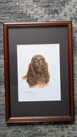 Très belle aquatinte d'un portrait de cocker. Datée 1938 et signée au crayon.
