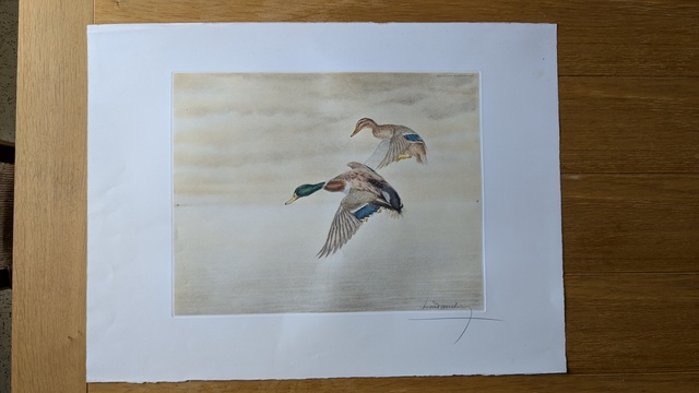 Très belle aquatinte d'un couple de colvert en vol avant de se poser. Signée au crayon, copyright L.Danchin .