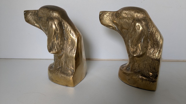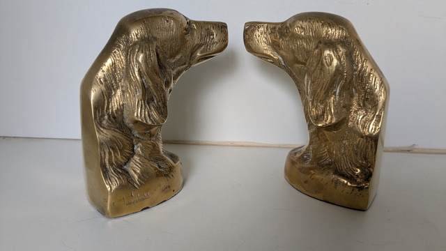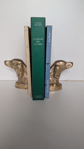 Paire de serres livres en laiton représentant des têtes d'épagneuls.